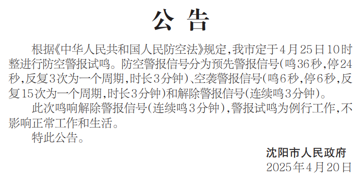 瀋陽人請注意!4月25日上午10點!全市將鳴響警報!