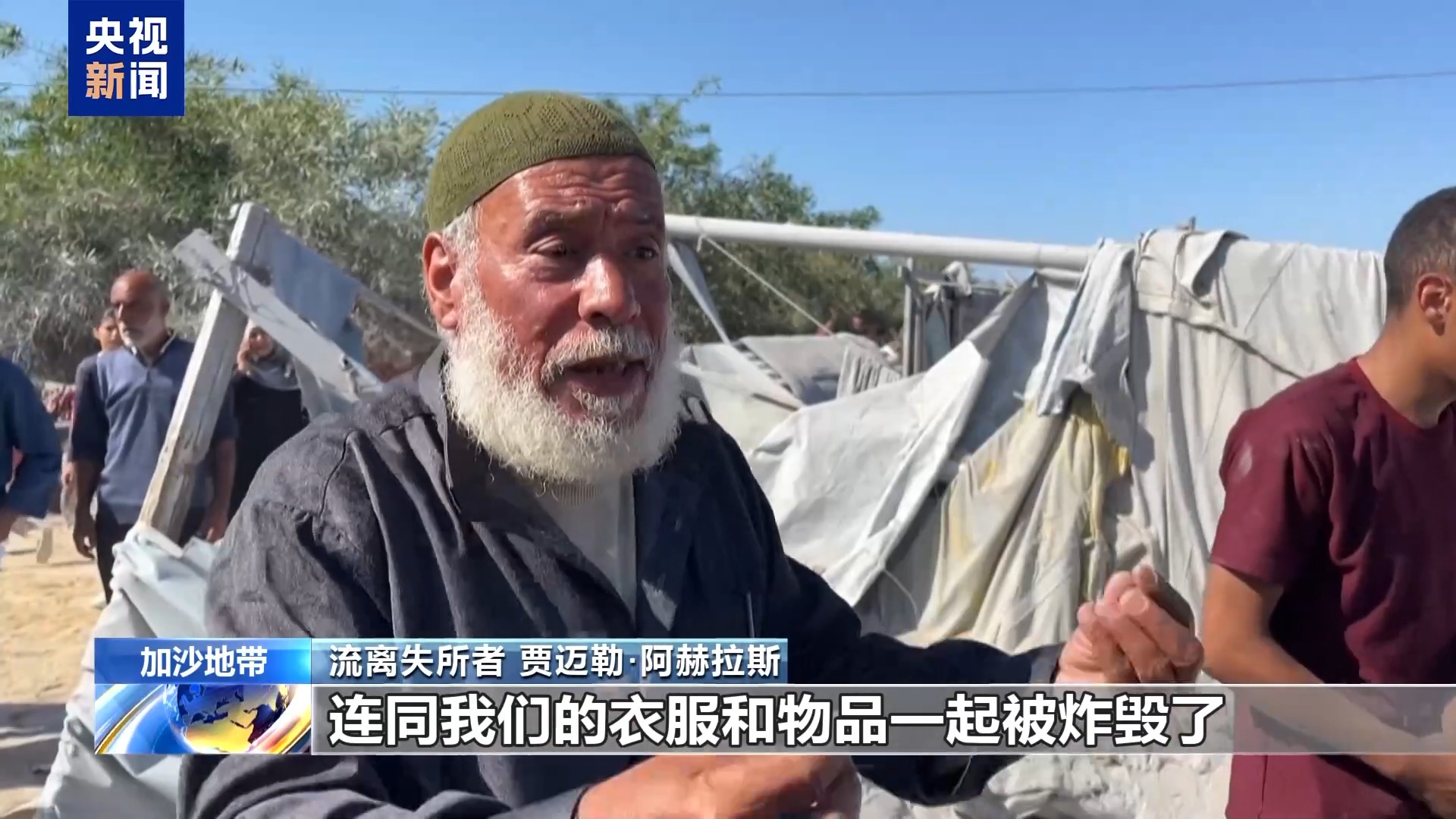 *加沙地帶 流離失所者 賈邁勒·阿赫拉斯:*我的住所被毀了,連我的帳篷在內,一共六頂帳篷連同我們的衣服和物品一起被炸燬了,一切都消失了。所有東西都被髮射過來的導彈摧毀了。我們是流離失所者,我們沒有武器或刀具,我們甚至沒有餐刀,只有把切蔬菜的小刀。我們只有這些了,爐子和燃氣都毀了。