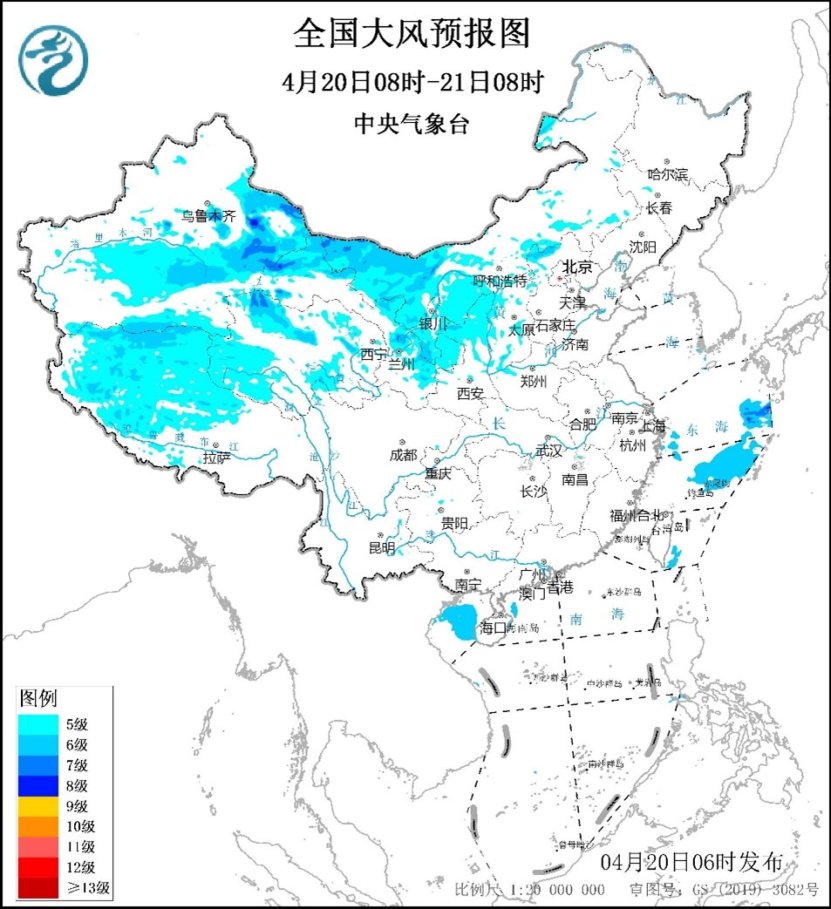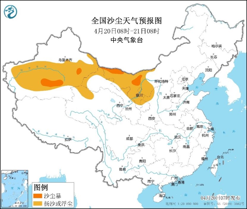 此外,20日至22日,受較強冷空氣影響,長江中下游以北地區氣温將先後下降6~8℃,內蒙古西部、西北地區東部等地局地降温超過10℃,並伴有4~6級、陣風8~9級大風,西北地區東部、內蒙古中西部、華北西部和北部等地部分地區陣風可達10級;東部海域有6~7級偏南轉偏北風,陣風8~9級;南疆盆地、西北地區東部、內蒙古中西部、華北、黃淮西部等地先後有揚沙或浮塵,局地有沙塵暴。其中今天,大風降温區主要在西北地區,部分地區還伴有揚沙或浮塵天氣,內蒙古西部等局地有沙塵暴。