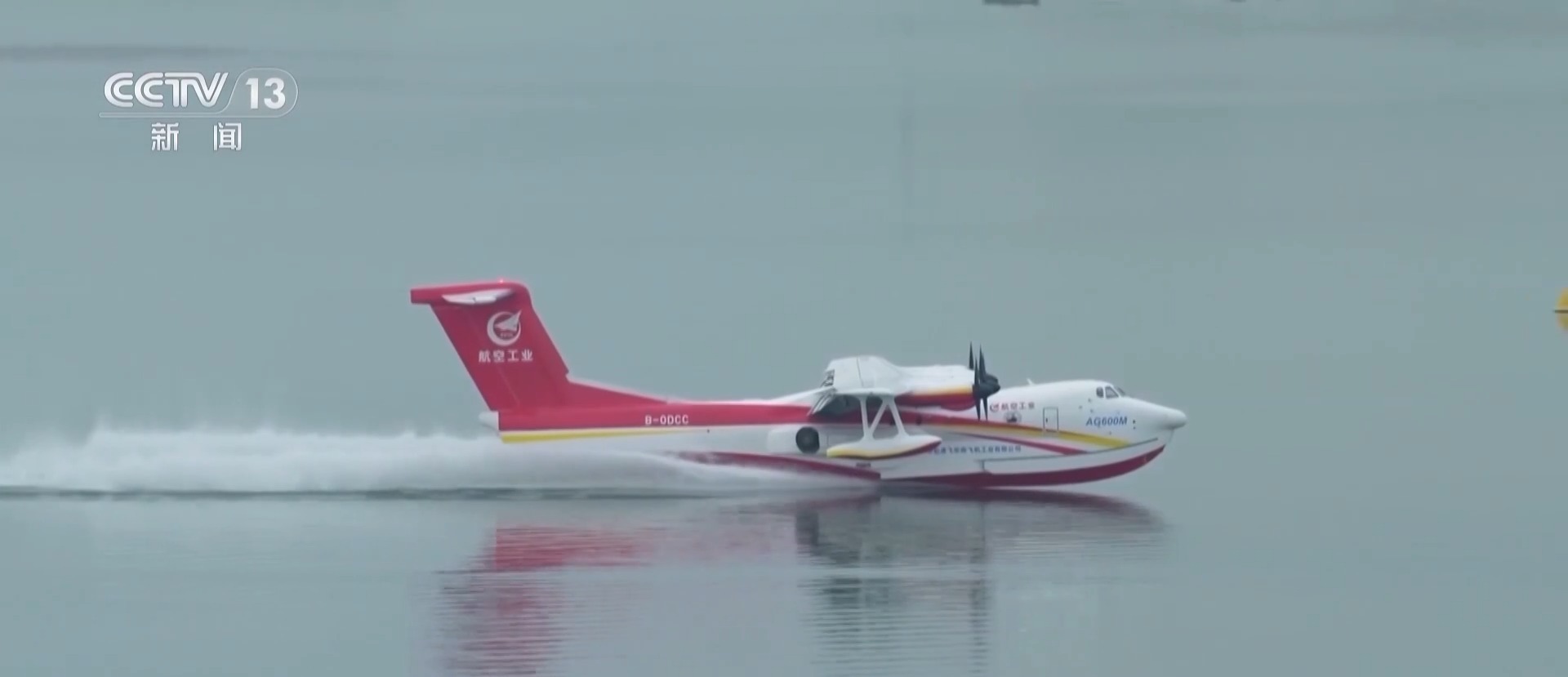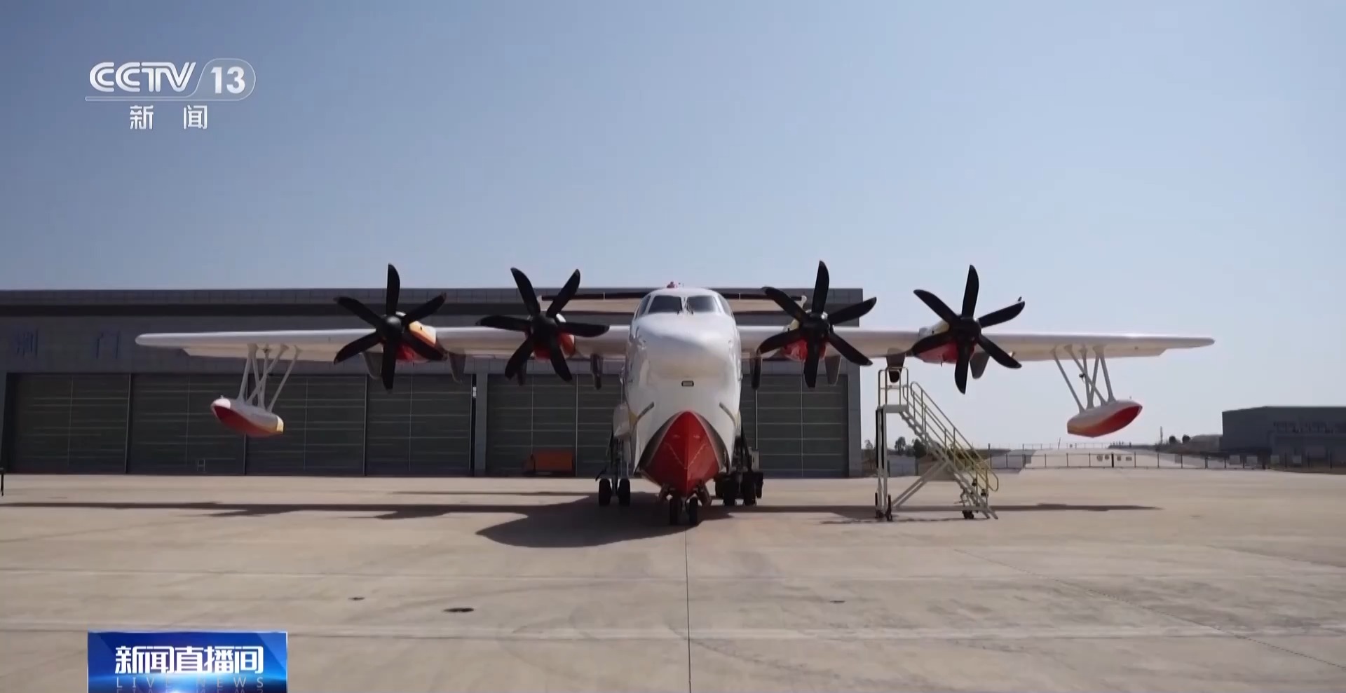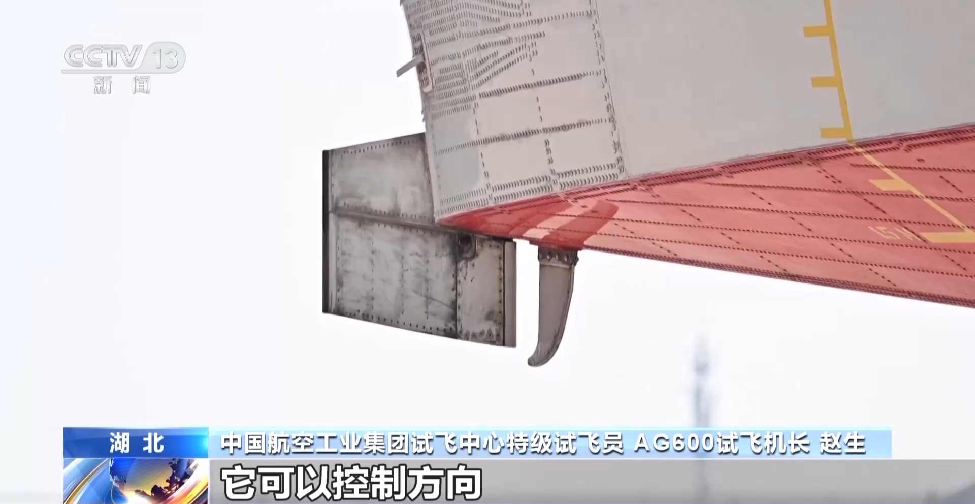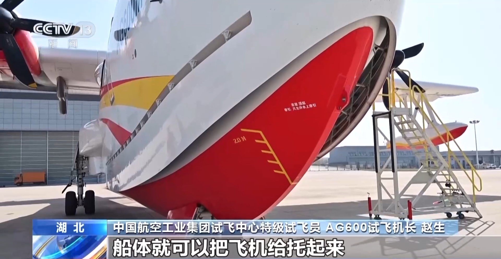 *中國航空工業集團試飛中心特級試飛員、AG600試飛機長 趙生:*這個結構,就是汲水用的。在水中的時候,這個裏邊有像一個舀子一樣的東西,可以翻過來。因為飛機有速度,水通過沖擊力就可以進到水箱裏邊去。現在可以在22秒左右裝滿12噸水,後邊還有提升的空間。