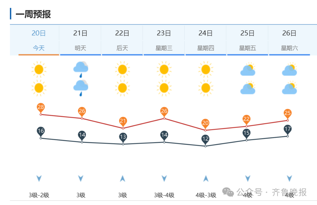最高氣温:北部沿海地區15°C左右,魯中山區和半島內陸地區18°C左右,其他地區21°C左右。