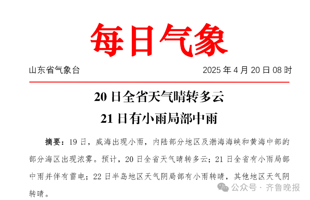 21日白天到夜間,*全省天氣多雲轉陰有小雨局部中雨並伴有雷電。*東營、濰坊、日照和半島地區南風轉北風4~5級陣風6~7級,其他地區南風4級陣風5~6級轉北風4~5級陣風6~7級,雷雨地區雷雨時陣風7~9級。
