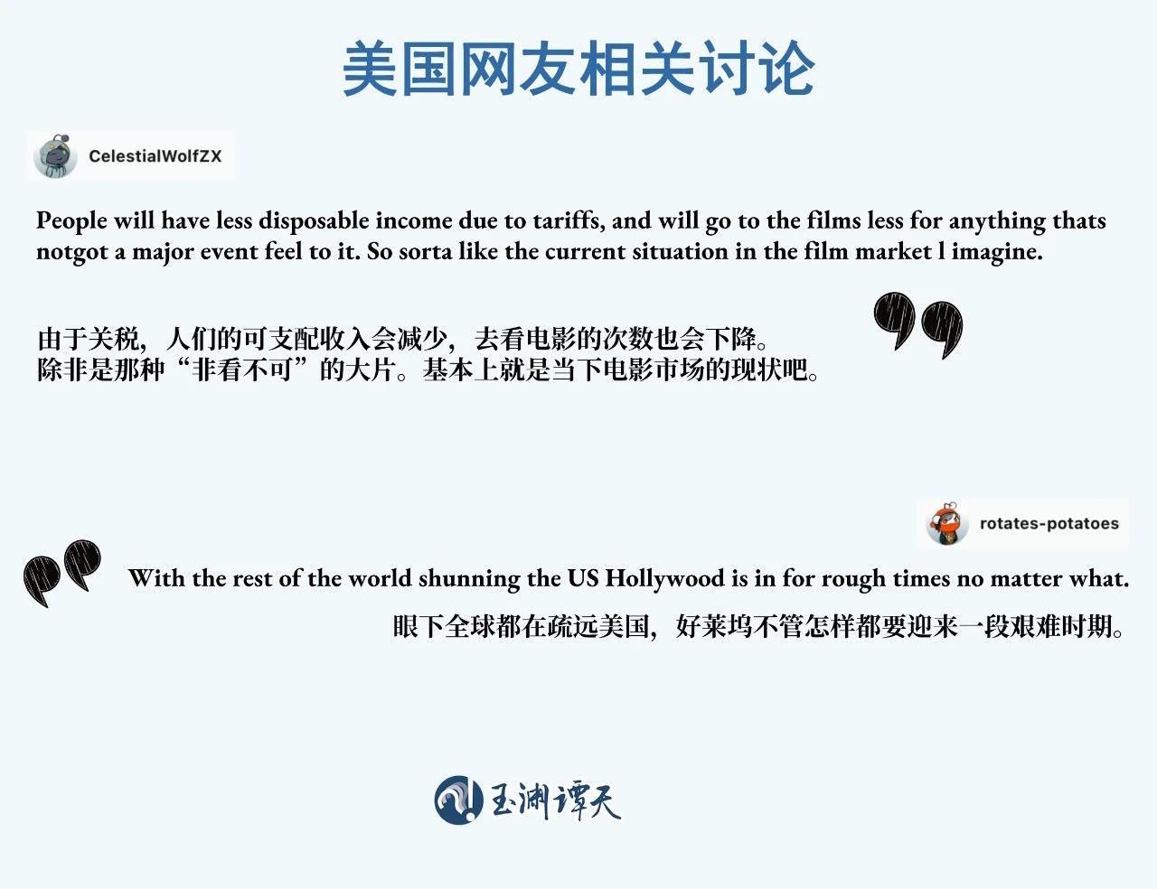 實際上,譚主近期在持續追蹤美國社交媒體平台上的相關討論,發現有99.2%的美國網友都認為美國政府對美國電影業造成了損害。