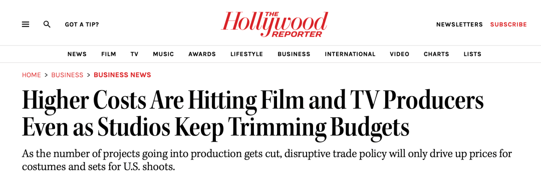 這是《好萊塢報道者》發表的一篇題為*《在電影行業縮減預算之際,美國電影製造商還要面臨高額關税夾擊》*的報道。