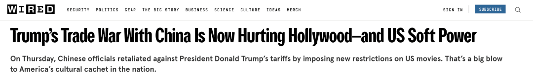 △這是美國媒體《WIRED》發表的一篇報道,主題是特朗普對華髮起貿易戰正傷害好萊塢與美國軟實力。