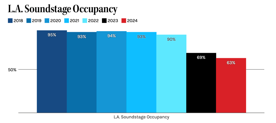 反映在數據上,FilmLA的報告顯示,2024年洛杉磯攝影棚使用率從90%以上驟降至63%,項目數量和拍攝天數均跌至近六年新低。