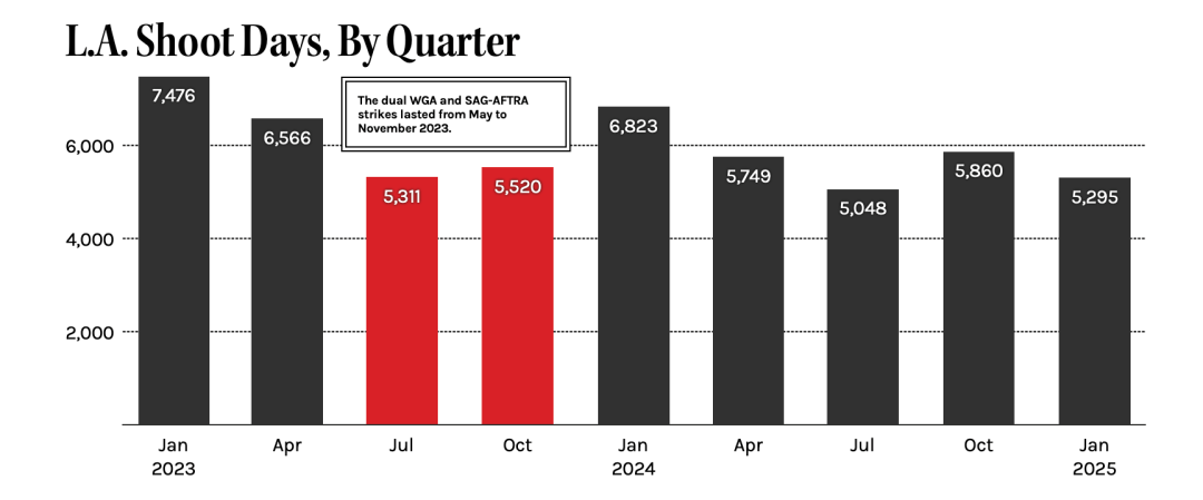2025年第一季度,洛杉磯地區街道上的外景拍攝總天數為5295天,而去年同期為6823天。相比去年,洛杉磯今年第一季度的拍攝天數下降了22%。