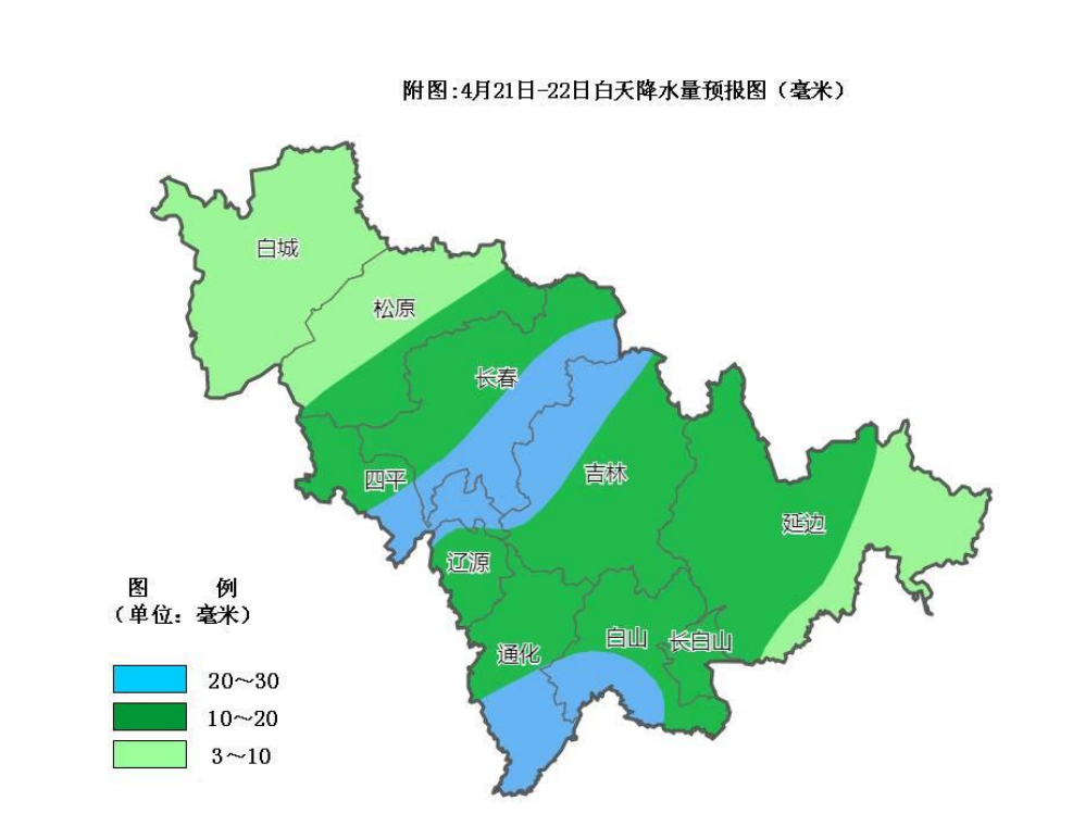 受高空槽影響,4月21日至22日白天,吉林省自西向東將有一次明顯降雨天氣過程,降水主要集中在21日夜間。 中部和南部將出現*中到大雨,*降水後風力較大。