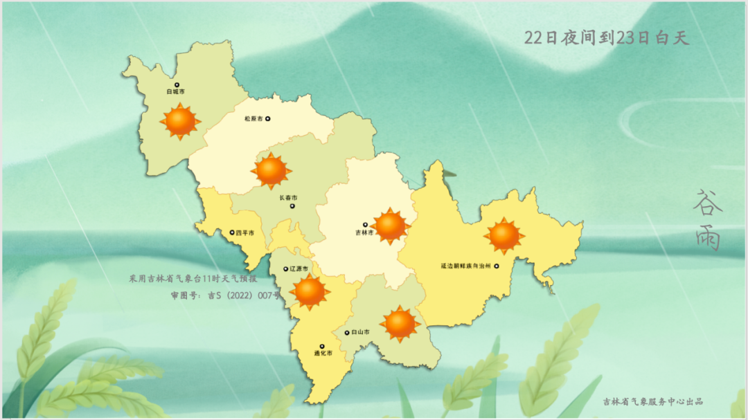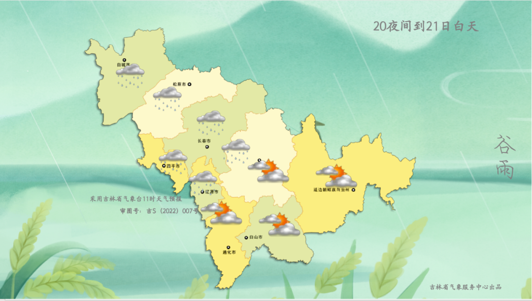 今天夜間到明天白天,全省晴轉多雲,白城、松原、長春、四平、遼源北部、吉林西部有小雨。