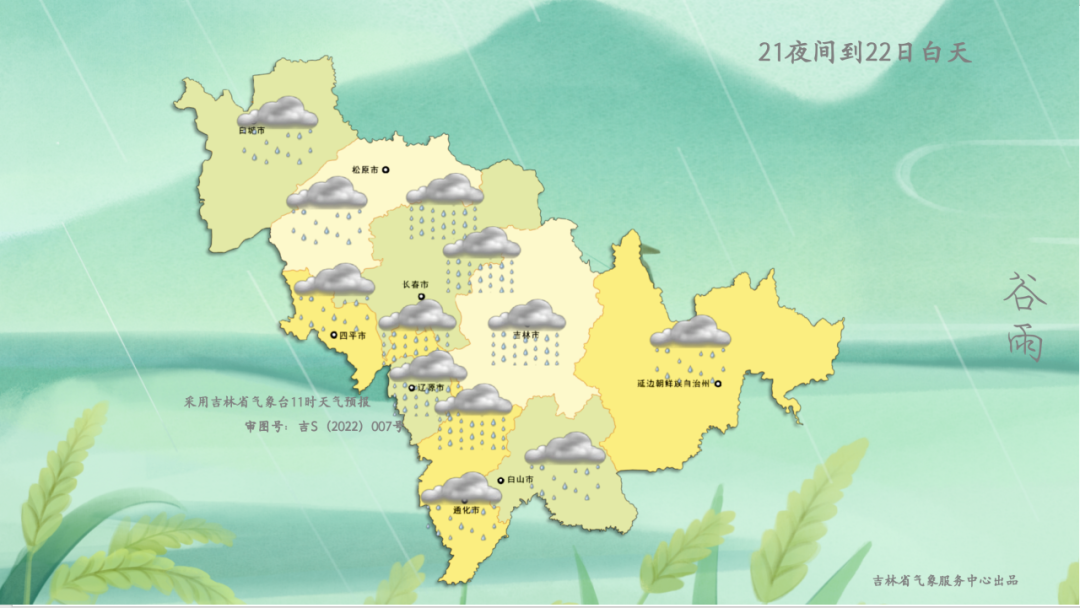 明天夜間到後天白天,全省多雲,長春北部和東部、四平東南部、遼源、吉林、通化北部有*中雨,*其他地區有小雨。