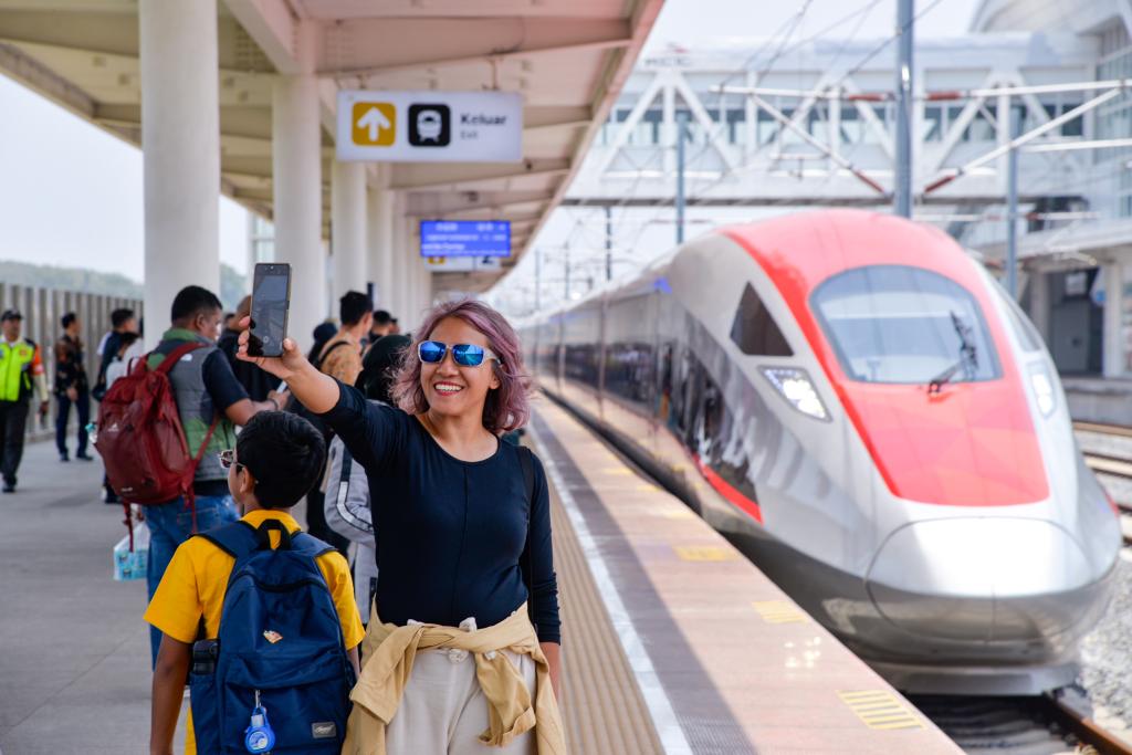 2024年10月17日,在印度尼西亞帕達拉朗站,乘客在雅萬高鐵高速動車組前自拍。新華社記者徐欽攝