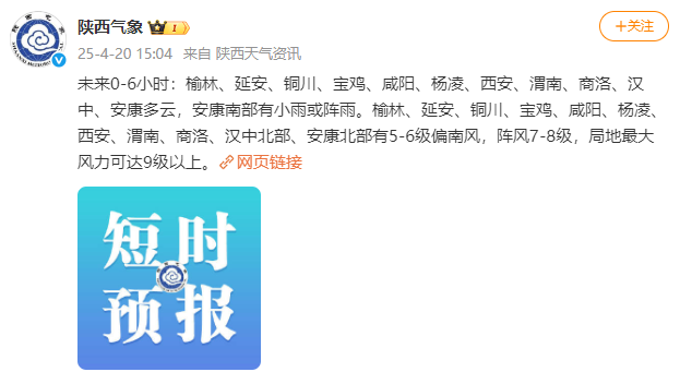 未來0-6小時:榆林、延安、銅川、寶雞、咸陽、楊凌、西安、渭南、商洛、漢中、安康多雲,安康南部有小雨或陣雨。榆林、延安、銅川、寶雞、咸陽、楊凌、西安、渭南、商洛、漢中北部、安康北部有5-6級偏南風,陣風7-8級,局地最大風力可達9級以上。