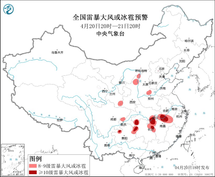 預計4月20日20時至21日20時,江漢南部、江南西部和北部、西南地區東部等地的部分地區將有8級以上雷暴大風或冰雹天氣,其中,安徽西南部、湖北南部和東部、湖南西北部和東北部、江西北部、貴州北部等地的部分地區將有10級以上雷暴大風,最大風力可達12級以上;華北西部和東南部、黃淮西部、江淮中西部、江漢、江南北部和西部、西南地區東部等地的部分地區將有小時雨量大於20毫米的短時強降水天氣,其中,湖北東南部、湖南北部、江西北部等地的部分地區小時雨量大於50毫米,最大可達70毫米以上。