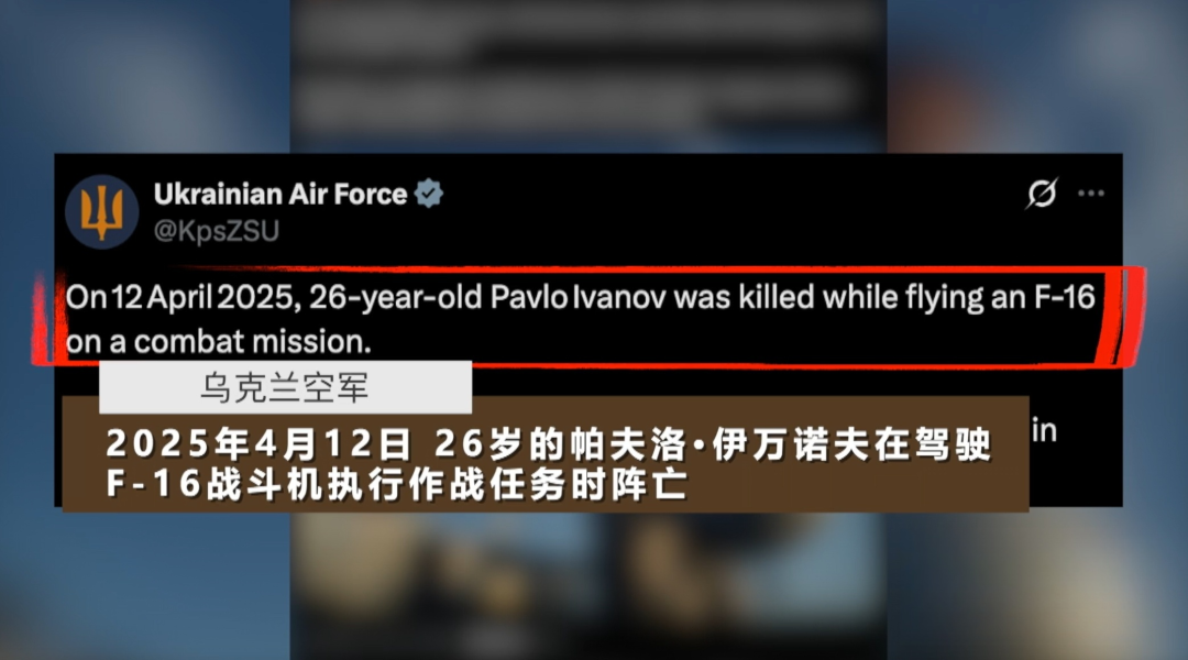 4月12日,烏克蘭空軍在社交平台上發佈聲明稱,26歲的帕夫洛·伊萬諾夫當天在駕駛美製F-16戰鬥機執行作戰任務時陣亡。