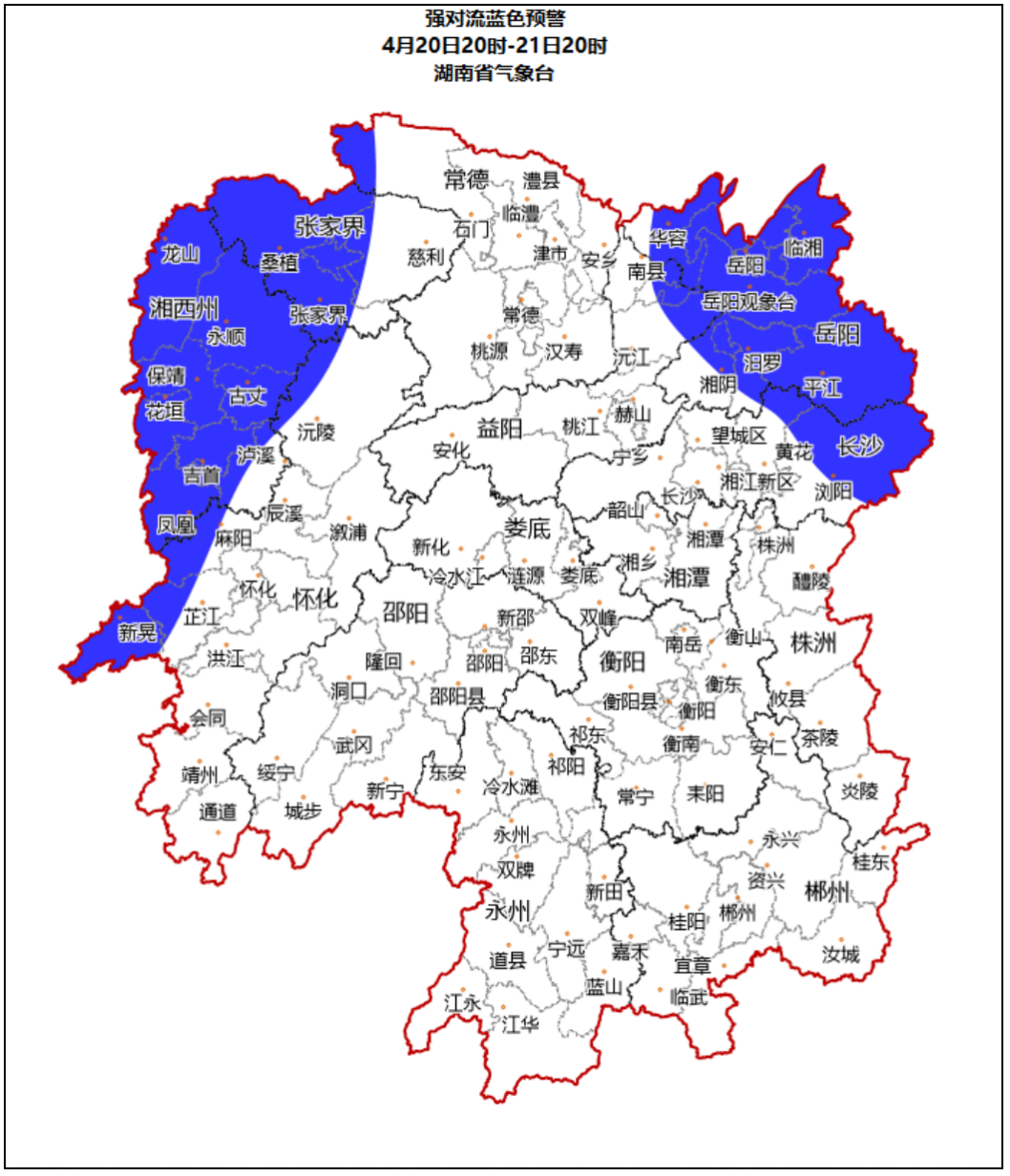 20日20時至21日20時,湘西州東北部,長沙市西部,岳陽市西部,張家界西部等局地發生山洪災害的可能性較大,岳陽市東北部、西南部,長沙市西北部,湘西州西北部,張家界西部等局地可能發生山洪災害。