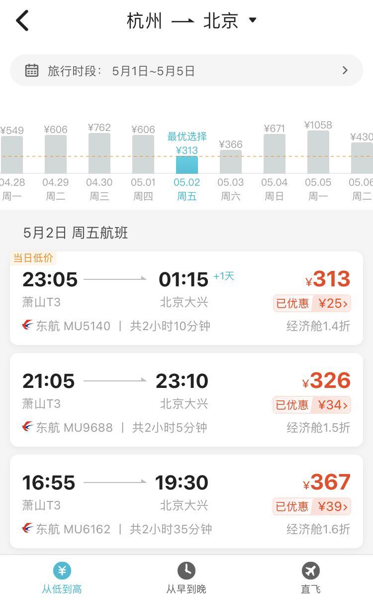 5月2日,杭州飛北京經濟艙機票價格最低為313元(不含税),相當於打了1.4折。