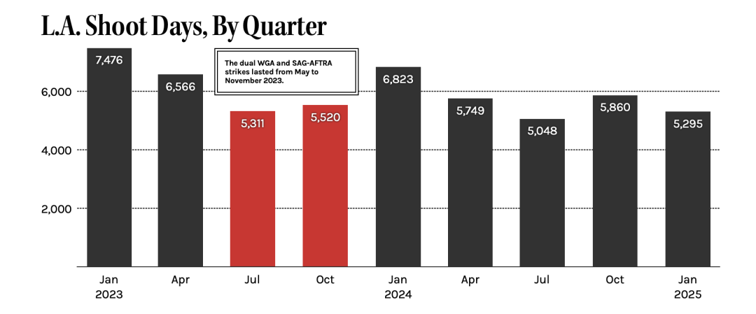 2025年第一季度,洛杉磯地區街道上的外景拍攝總天數為5295天,而去年同期為6823天。相比去年,洛杉磯今年第一季度的拍攝天數下降了22%。