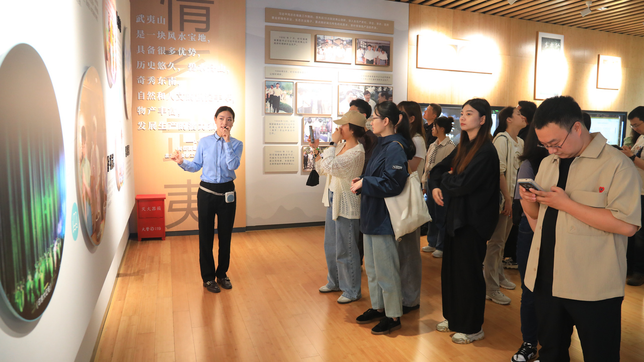 而那座嶄新的三茶展示館,就靜靜地矗立在這片綠色的海洋邊,等待着人們去揭開它的神秘面紗。館內的布展內容豐富多樣,以武夷山茶的歷史、發展成就和規劃為主線,兼具文化科普、互動體驗、成果展示等多重功能。在文化科普區域,記者瞭解到武夷巖茶獨特的“巖骨花香”。原來,巖茶的香氣來源於茶樹生長在特殊的岩石土壤中,這種土壤賦予了茶葉獨特的礦物質風味;而巖骨則是指茶葉在烘焙過程中形成的一種堅硬而有質感的口感,它代表了巖茶的核心特徵。這些知識讓我對武夷巖茶有了更深的認識和理解。