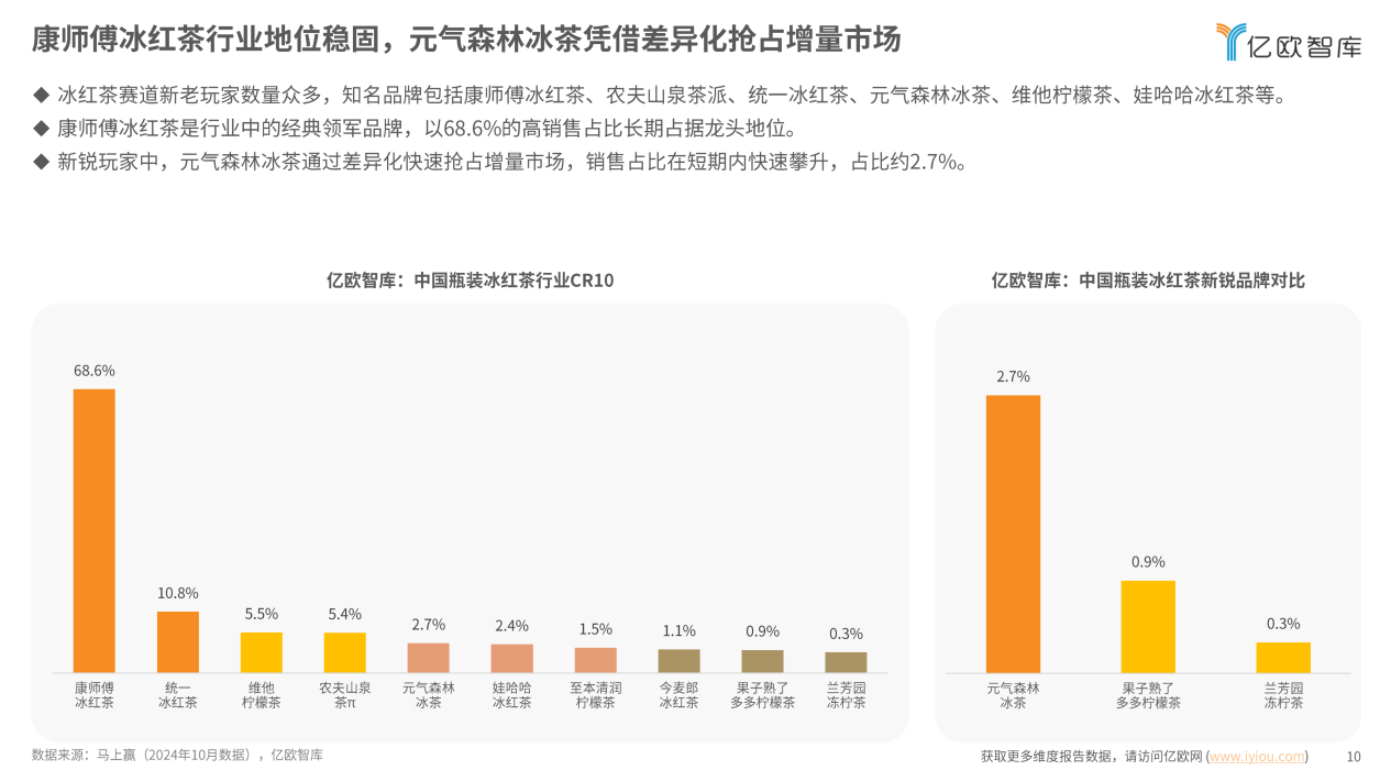 冰紅茶是世界上唯一一個靠單一口味站穩一個賽道的超級品類,2023年市場規模已達533億美元。中國瓶裝冰紅茶歷經三十餘年發展,市場競爭尤為激烈,康統兩大經典品牌長期佔據主導地位,而隨着大眾消費升級和健康意識的提升,冰紅茶行業逐漸走向年輕態、健康化,為元氣森林、果子熟了、蘭芳園等新鋭品牌提供了廣闊的市場空間。