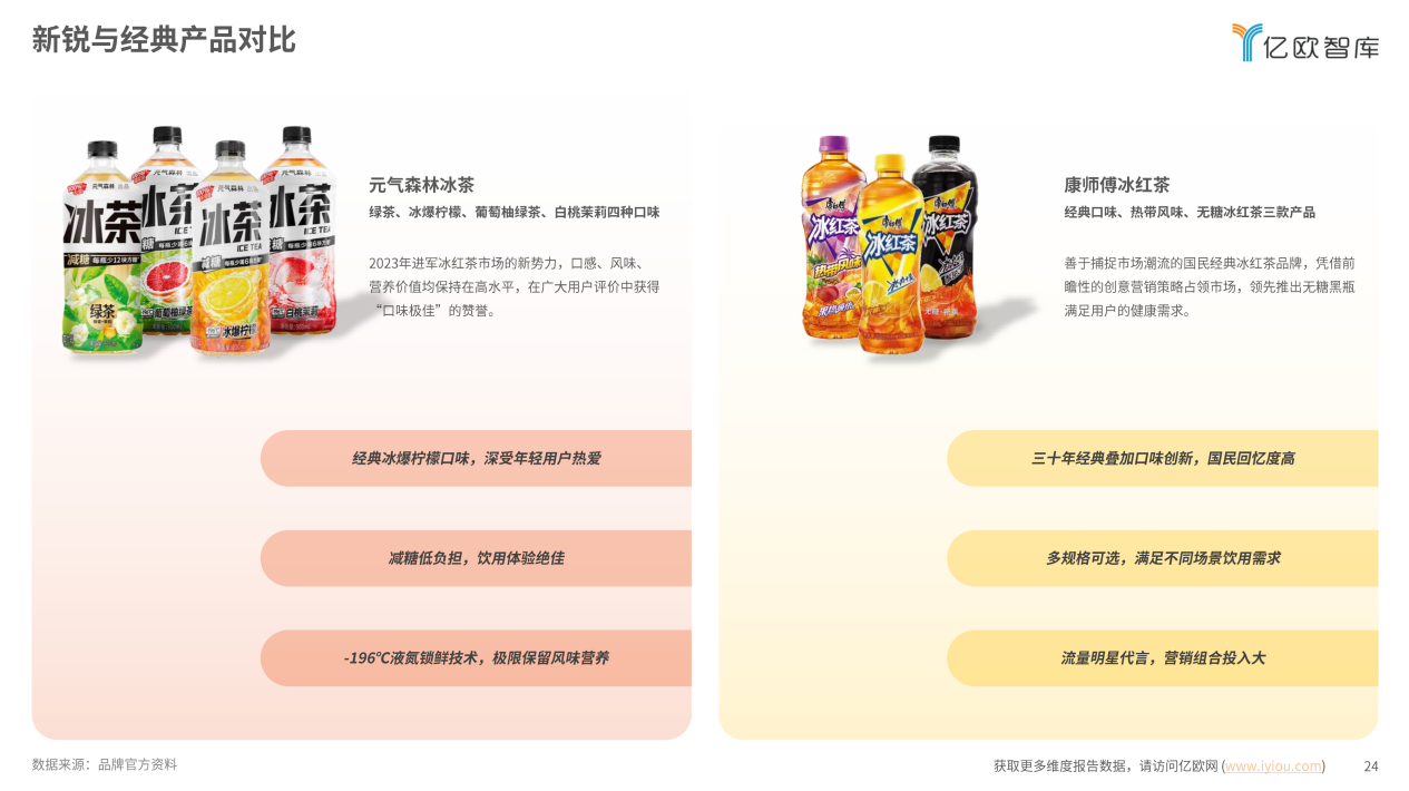 多款無糖、減糖冰紅茶產品相繼上市,也讓這個看似穩固的市場悄然推進一場“健康革命”。例如康師傅、統一曾推出多款產品零糖版本,但受限於口味等原因,銷量遠不及有糖版本;維TA、茶派等品牌着手升級配方,新入局的元氣森林冰茶則直接將減糖作為產品的核心賣點,在經典產品基礎上減少25%糖量,同時保留了冰紅茶酸甜爽口的風味,以差異化的減糖不減味,滿足了消費者對健康與美味的雙重追求。