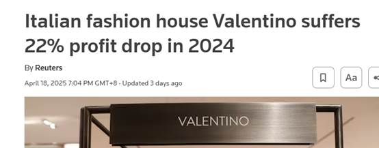 【環球網財經綜合報道】據路透社消息,意大利知名時裝品牌華倫天奴(Valentino)於近日發佈聲明,披露其2024年財務業績。數據顯示,受全球奢侈品行業需求波動,尤其是亞洲市場高端商品消費疲軟的影響,該公司去年營業利潤較前一年下降22%。