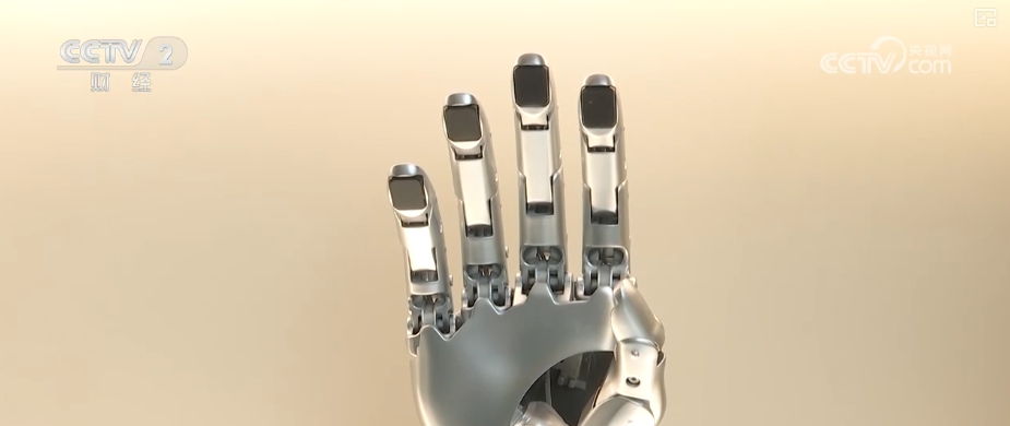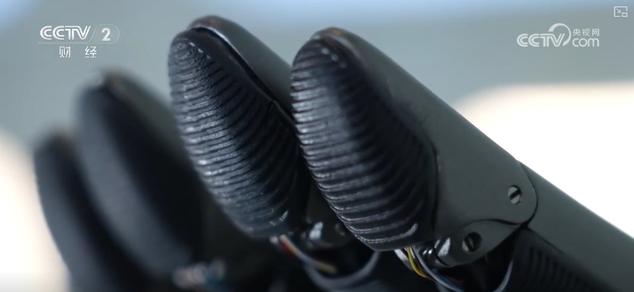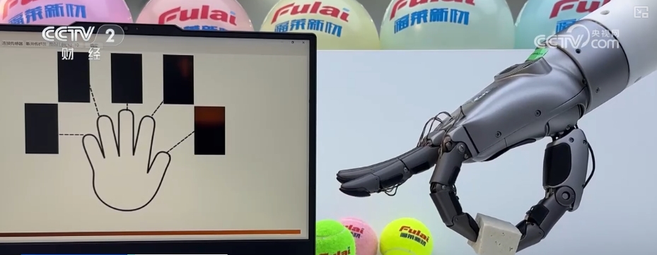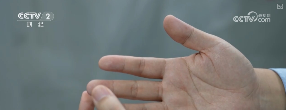 用不同的力度來測試機器人的每一根手指,可以看出小拇指的反饋力度會更強烈一些,這樣靈敏的動作背後是因為它指尖的這個地方集成了密密麻麻的柔性傳感器,這麼小的面積最多可以集成幾百個柔性傳感器。
