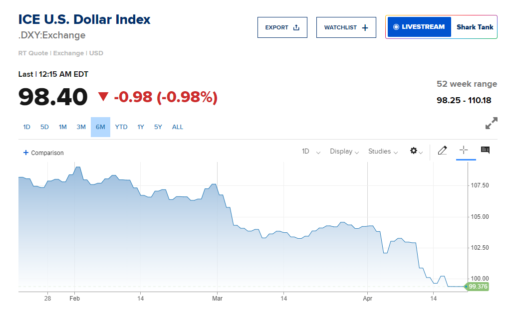 衡量美元對六種主要貨幣匯率變化的美元指數過去數月來大幅震盪走低。截至北京時間4月21日12時,洲際交易所美元指數報98.40,跌幅0.98%,跌破99關口,為2022年4月以來首次。