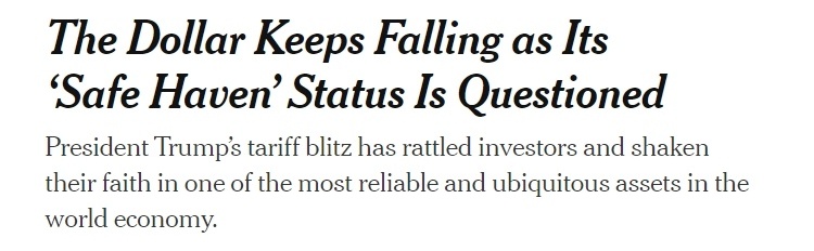 △《紐約時報》刊文“美元持續下跌 其‘避風港’地位受到質疑”