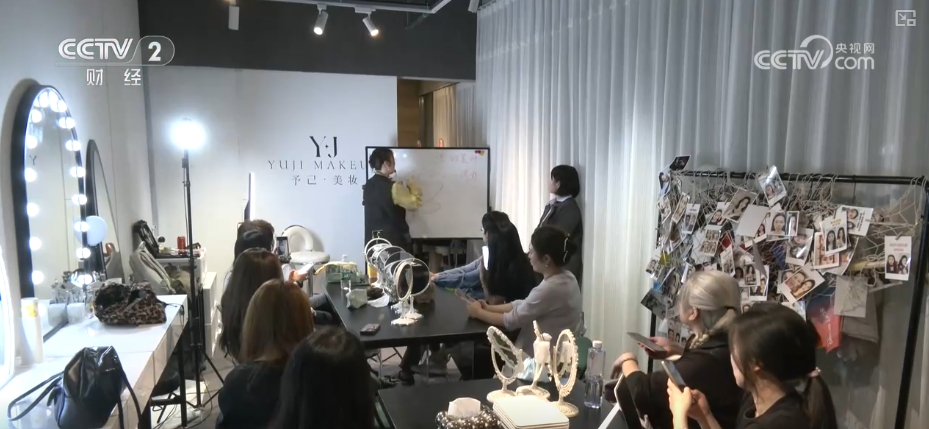 北京秀水街的一家服裝店裏正在開設化妝培訓班。服裝店負責人説,除了增加了和夜校場地合作的額外收入,夜校還像是一個流量入口,素人改造、達人合作,都能給門店帶來新的變化。