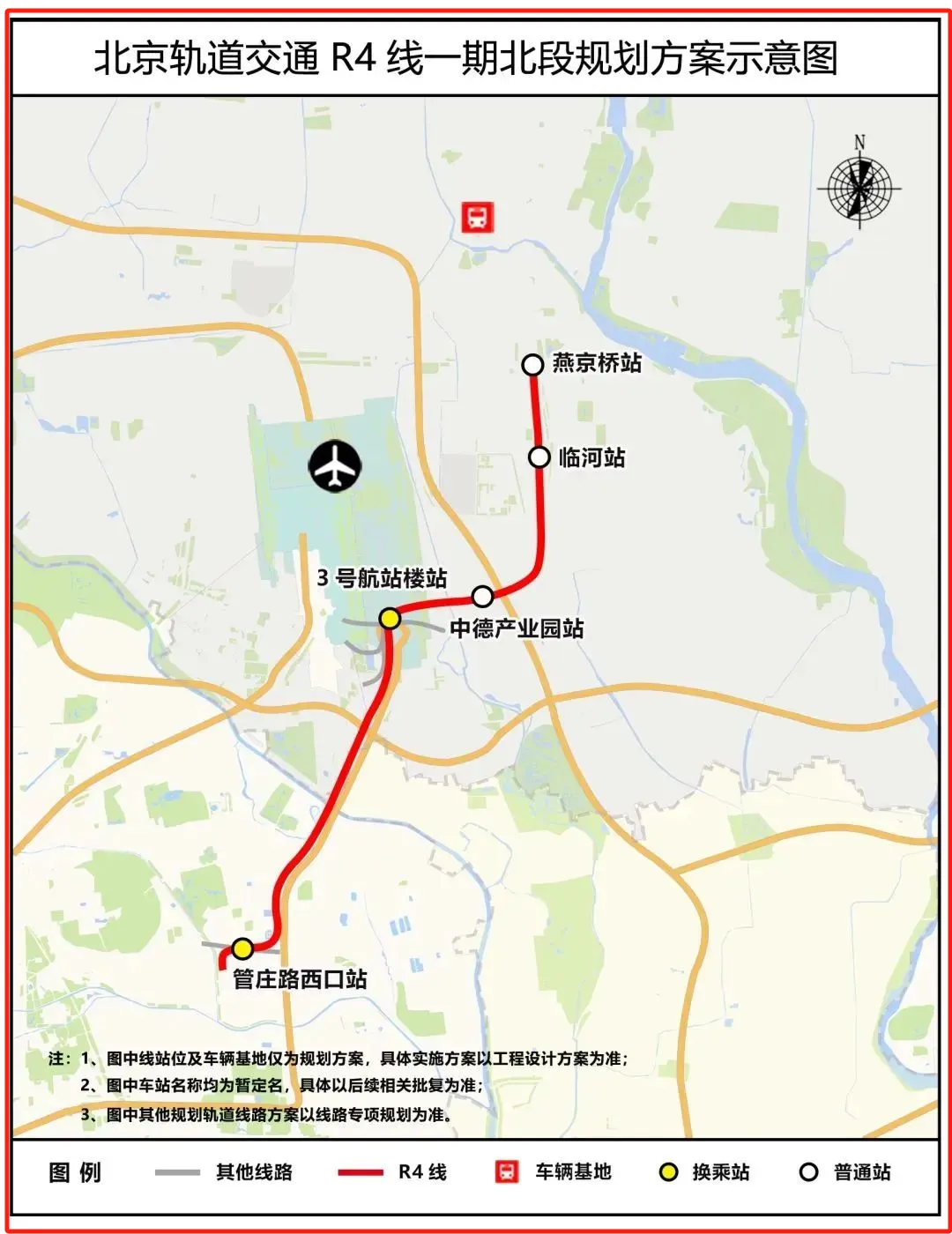 值得一提的是,規劃的車站中有兩座為換乘站,未來可在管莊路西口站換乘3號線,在3號航站樓站*換乘首都機場線、S6線等。*新建車輛基地位於順義仁和組團以北地區,城北減河以北,通順路以西,佔地約25公頃。R4線一期北段建成後將進一步推動平原新城高質量發展,進一步提升首都機場陸側交通服務水平,進一步完善本市軌道交通線網。