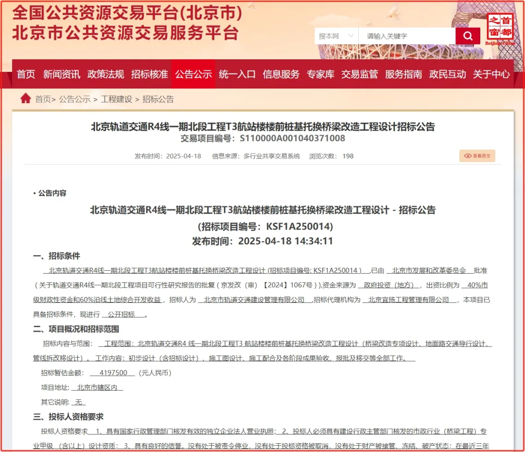 4月18日,R4線一期北段工程T3航站樓樓前樁基託換橋樑改造工程設計招標公告發布。