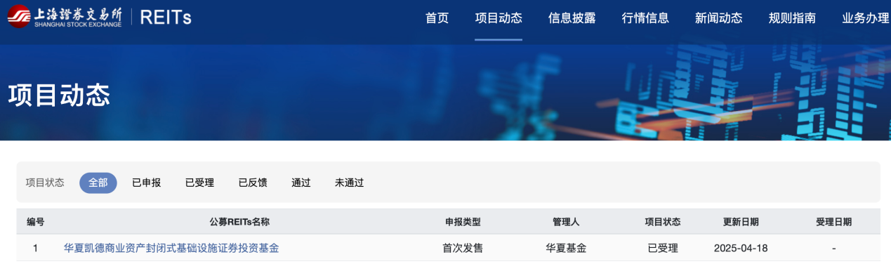 【環球網財經綜合報道】近日,上海證券交易所最新披露信息顯示,一隻名為“華夏凱德商業資產封閉式基礎設施證券投資基金”的基礎設施公募REIT項目狀態已更新為“已受理”。