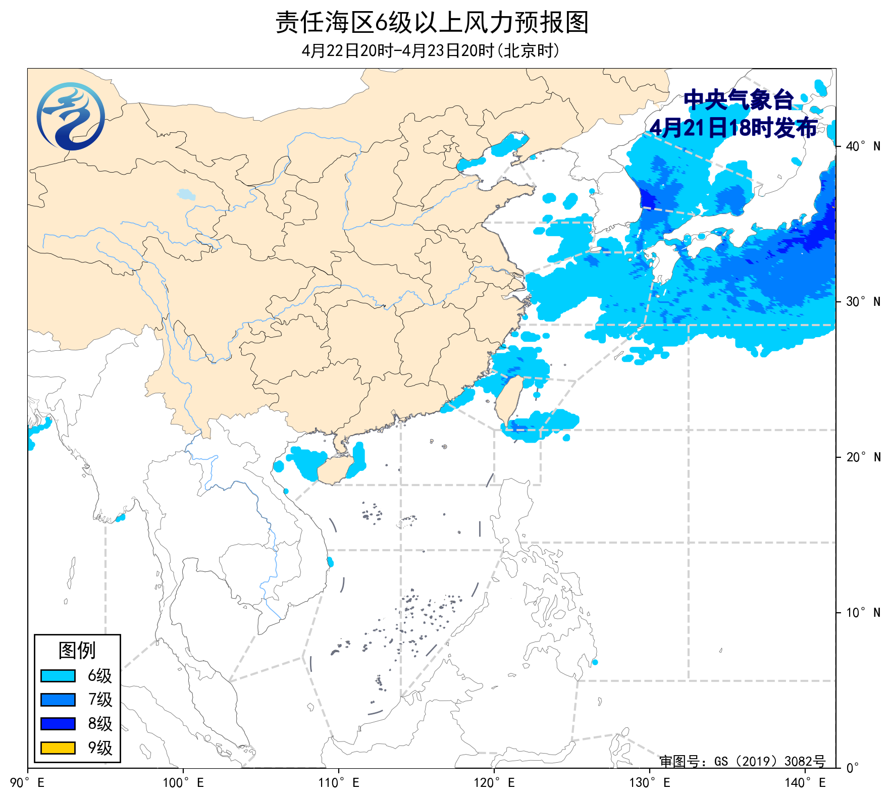 21日20時至22日20時,渤海將有5~6級、陣風7級的偏北風,黃海中部海域將有4~6級、陣風7級的東南風轉偏北風,黃海南部海域將有5~6級、陣風7級的偏南轉偏北風,東海大部海域、台灣海峽、台灣以東洋麪、北部灣將有4~6級、陣風7級的偏南到西南風。渤海海峽、黃海大部海域、東海大部海域將有能見度不足10公里的輕霧,其中長江口及杭州灣附近海域、舟山羣島附近海域、上海港、寧波港將有能見度不足1公里的大霧。