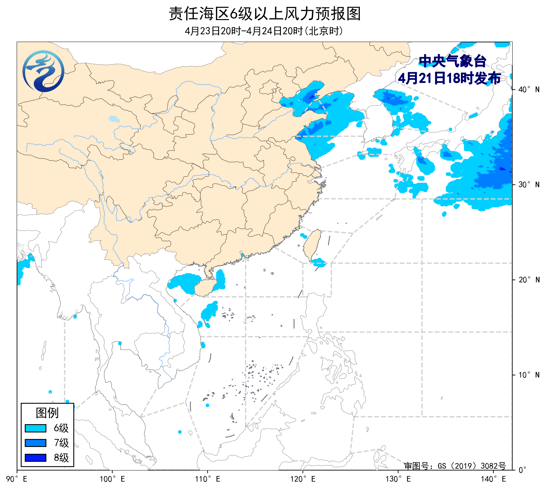 24日夜間到26日白天,渤海、渤海海峽、黃海大部海域、東海大部海域、台灣海峽、台灣以東洋麪將先後有6~7級、陣風8~9級的大風;28日白天,東海東部和南部海域將有6~7級、陣風8~9級的偏南風。