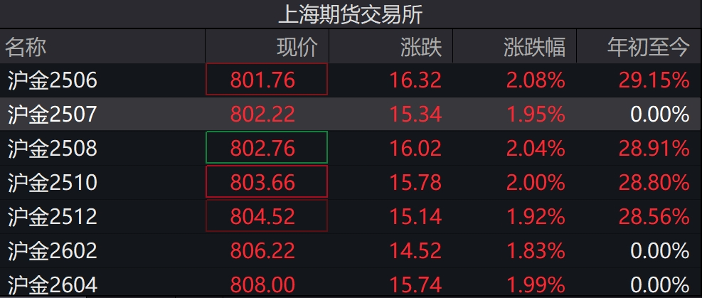 Wind數據顯示,*當日早盤,上期所多隻黃金期貨合約盤初快速拉昇,站上800元/克關口,紛紛突破前高,此後維持高位震盪。*截至4月21日10時10分發稿,上期所8只黃金期貨合約價格均在800元/克上方,漲幅普遍超過2%。其中,滬金2506現報801.76元/克,日漲幅為2.08%,年初至今漲幅超過29%;滬金2604合約現價最高,達到808元/克,當日漲近2%。