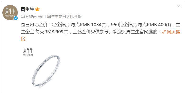 21日,記者查詢發現,*周生生足金飾品標價已達1034元/克,相比4月7日黃金低位912元/克,14日內累計漲122元。*老廟、周大福足金飾品標價則分別攀升至1038元/克、1039元/克,克價紛紛逼近1040元。