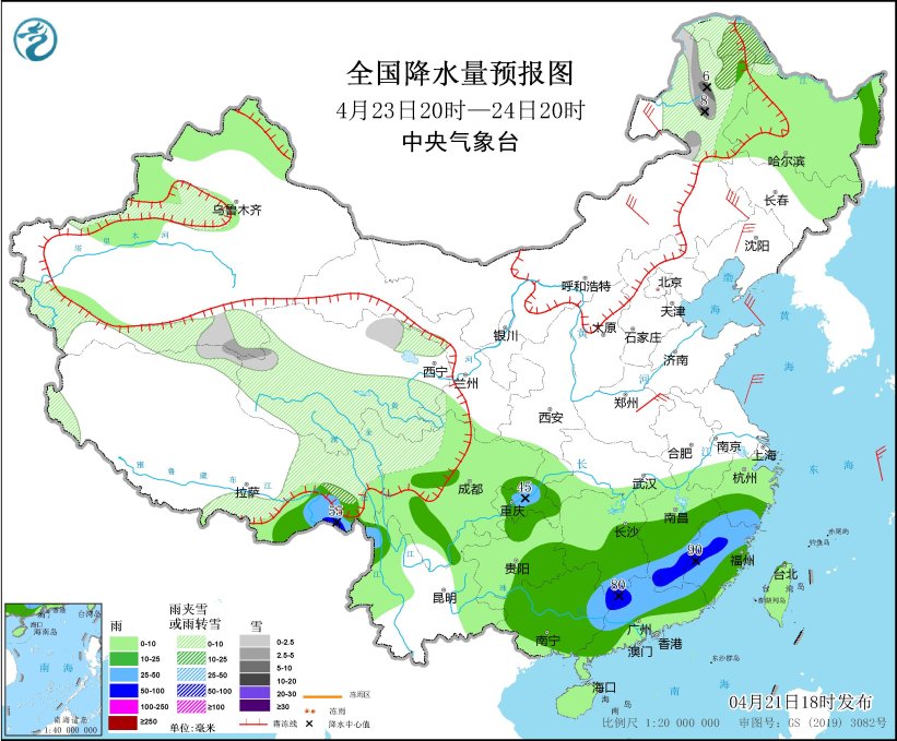 *4月23日20時至24日20時,*新疆沿天山地區、青海中南部、內蒙古東北部、川西高原北部、西藏東北部等地部分地區有小到中雪或雨夾雪,其中,內蒙古東北部局地有大雪(5~8毫米)。江南中南部、華南大部、四川南部、重慶中南部、貴州東部、西藏東南部等地部分地區有中到大雨,其中,江西南部、廣東北部、福建西部以及西藏東南部等地部分地區有暴雨(50~90毫米)。內蒙古東部、遼寧等地部分地區有4~6級風(見圖5)。