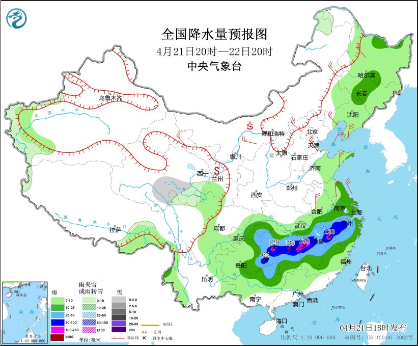 *4月21日20時至22日20時,*新疆南疆西部山區、青海東南部、內蒙古東北部等地部分地區有小雪或雨夾雪。吉林中部、江淮東部、江南大部以及重慶東部、貴州東部、廣西北部、福建西部等地部分地區有中到大雨,其中,湖南中部、江西北部、浙江西部等地部分地區有暴雨到大暴雨(100~150毫米)。內蒙古中東部、甘肅河西、黑龍江西部、遼寧大部、河北北部、山東半島、蘇皖北部等地部分地區有4~6級風(見圖3)。