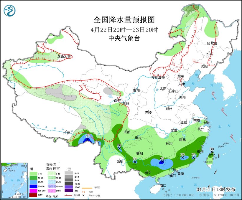 *4月22日20時至23日20時,*新疆沿天山地區南疆西部山區、青海中南部、內蒙古東北部、川西高原北部、西藏東北部等地部分地區有小雪或雨夾雪。華南大部、四川南部、貴州南部、雲南東部、西藏東南部等地部分地區有中到大雨,其中,廣西東北部、西藏東南部等地部分地區有暴雨(50~70毫米)。內蒙古中東部、河北等地部分地區有4~6級風(見圖4)。