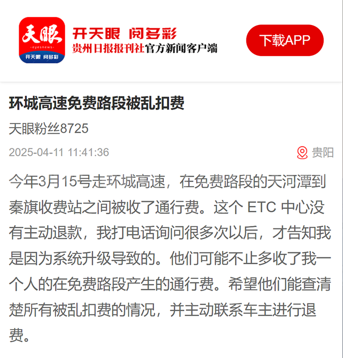 近日,貴陽市民鄔先生向貴州日報天眼新聞“天眼問政”欄目反映,他駕車行駛環城高速時,在免費路段被收了通行費。當時ETC中心沒有主動退款,而是在他多次致電反映後才有結果。