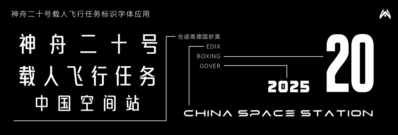 神舟二十號載人飛行任務標識選用了四種字體。這些字體的使用主要為了凸顯出以*“科幻”與“夢想”*為關鍵詞的設計理念,通過調整字體間距來滿足構成需求,並與整體視覺風格相契合。