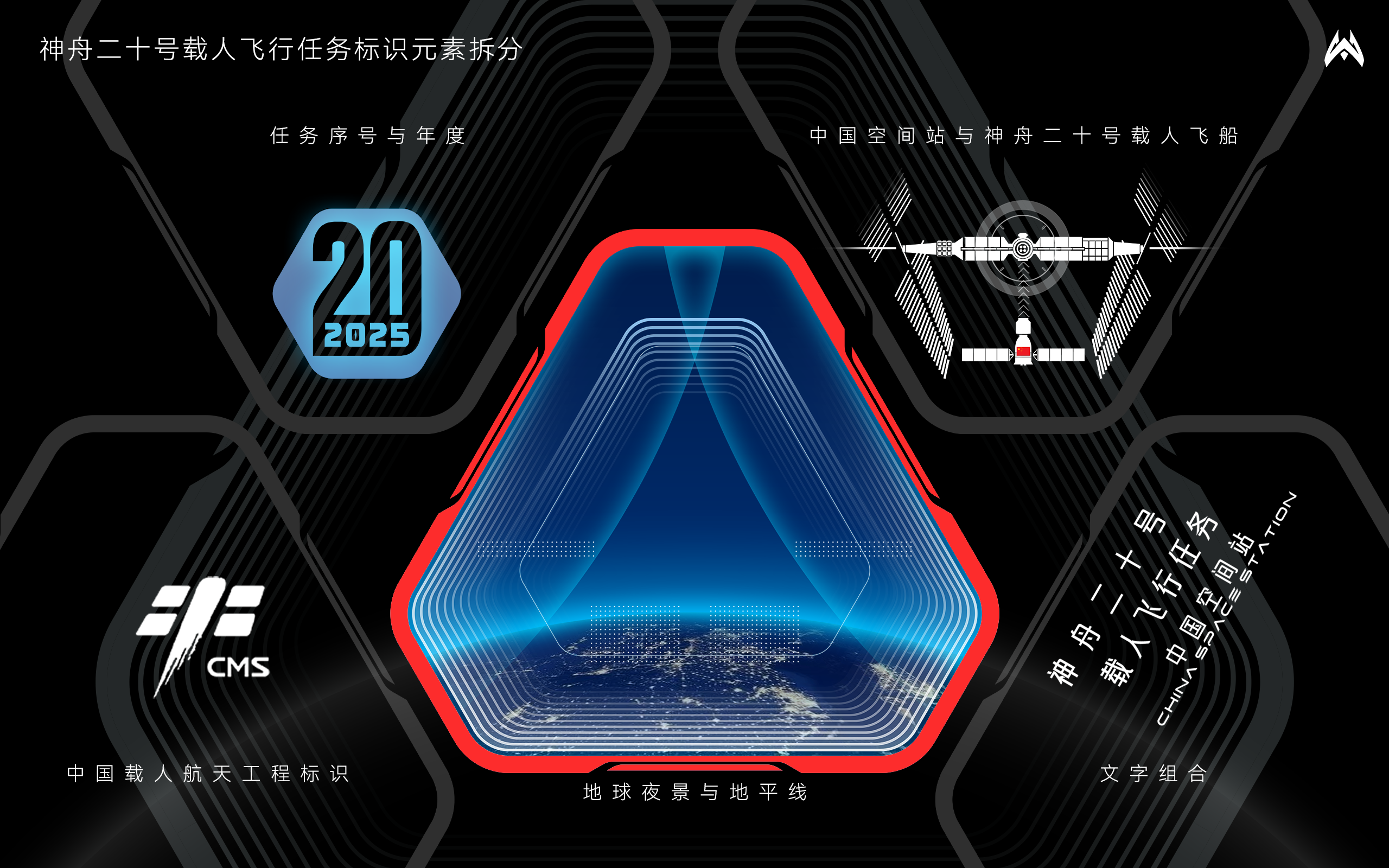 標識的主要元素由地球、中國空間站以及神舟二十號載人飛船組成,以“精準”“縱深”與“聚焦”作為設計主題將這些元素通過大透視及漸變重新構成,整體呈現更強烈的視覺層次,模擬一種通過舷窗望向外部空間的視覺感受。