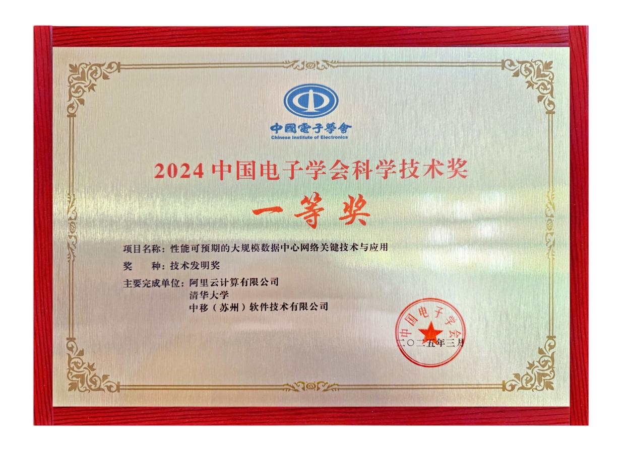 近日,中國電子學會正式頒發“2024 年中國電子學會科學技術獎”,由阿里雲聯合清華大學、中國移動(蘇州)軟件技術有限公司共同申報的 “性能可預期的大規模數據中心網絡關鍵技術與應用” 項目榮獲中國電子學會技術發明一等獎。
