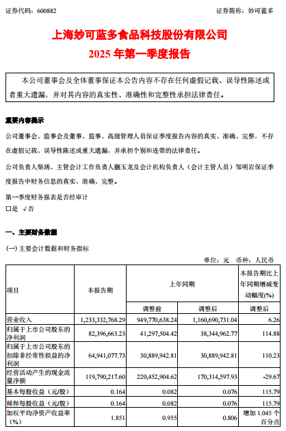 【環球網消費綜合報道】4月22日,妙可藍多發佈了2025年第一季度財務報告。數據顯示,2025年第一季度,妙可藍多實現營收12.33億元,同比增長6.26%。在淨利潤方面,實現歸母淨利潤8239.67萬元,同比大增114.88%。