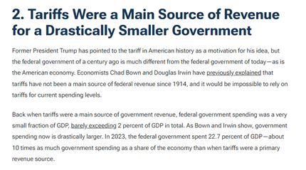 而且,一個世紀前的美國政府與今天大不相同。關税是政府收入的主要來源時,聯邦政府支出僅佔GDP的很小一部分,僅略高於GDP總額的2%。2023年,聯邦政府支出佔GDP的22.7%,是之前百分比的十倍。所得税帶來的收入顯然無法被關税取代。