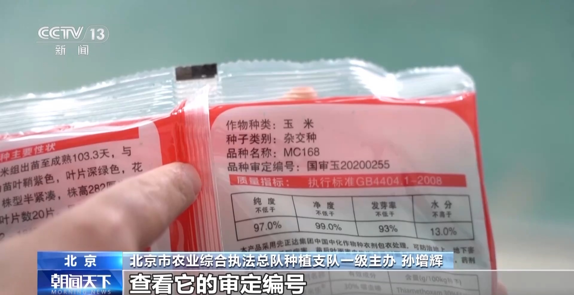 *北京市農業綜合執法總隊種植支隊一級主辦 孫增輝:*查看它的審定編號。第二個你要看咱們購種是不是適合在本地區種植和什麼時間種植。如果説出現了問題,可以對生產經營者進行查詢。