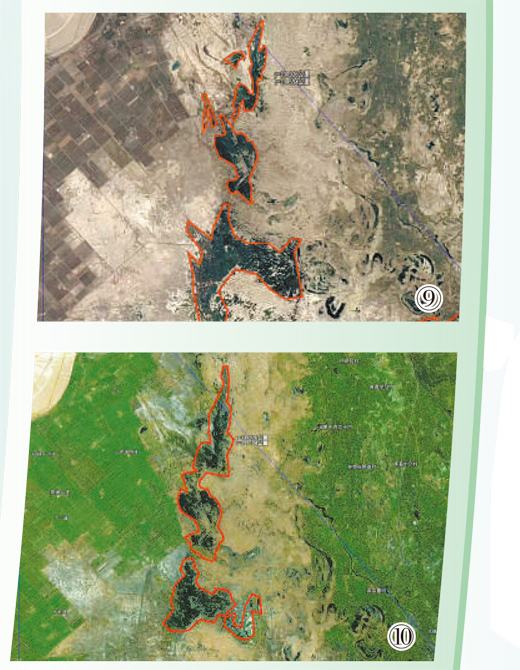 地表水被過量使用,生態用水被擠佔,水域面積不斷縮小,周邊植被退化,加劇土地荒漠化。大量高礦化度的農業排水影響沿岸植被生長。農田防護林網不完善,已有林帶退化嚴重,周邊沙化加劇。(見圖⑨)