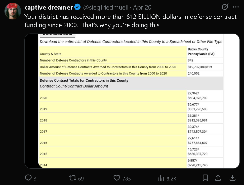 另外,有美國網民發現,菲茨帕特里克之所以跑去烏克蘭“秀強硬”,可能與他一直受到美國軍火商的資助有關。公開資料顯示,菲茨帕特里克也確實在給烏克蘭乃至以色列等其他國家和地區提供美國軍火上相當積極。而在菲茨帕特里克來自的賓夕法尼亞州,有當地媒體亦在近日一篇報道中透露,他所擁有的政治獻金是國會所有賓夕法尼亞州代表中最多的,已經超過600萬美元。