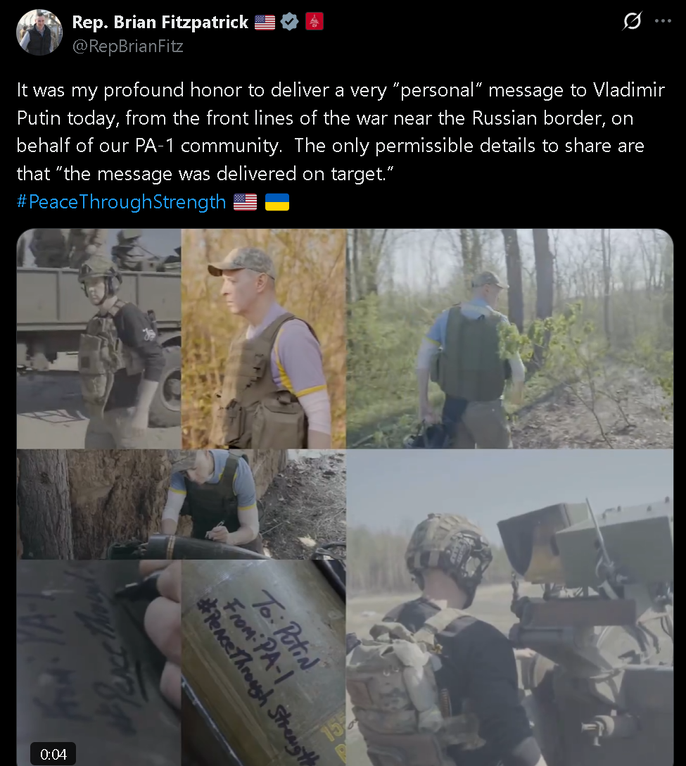 近日,在出訪烏克蘭時,菲茨帕特里克不僅與烏克蘭總統澤連斯基見了面,他還前往了烏克蘭軍隊的前線,並在一枚烏軍的炮彈上寫下了“送給普京,來自賓夕法尼亞第一選區”的內容,然後他還親自操作烏軍的武器,向俄軍的方向發射了這枚炮彈。
