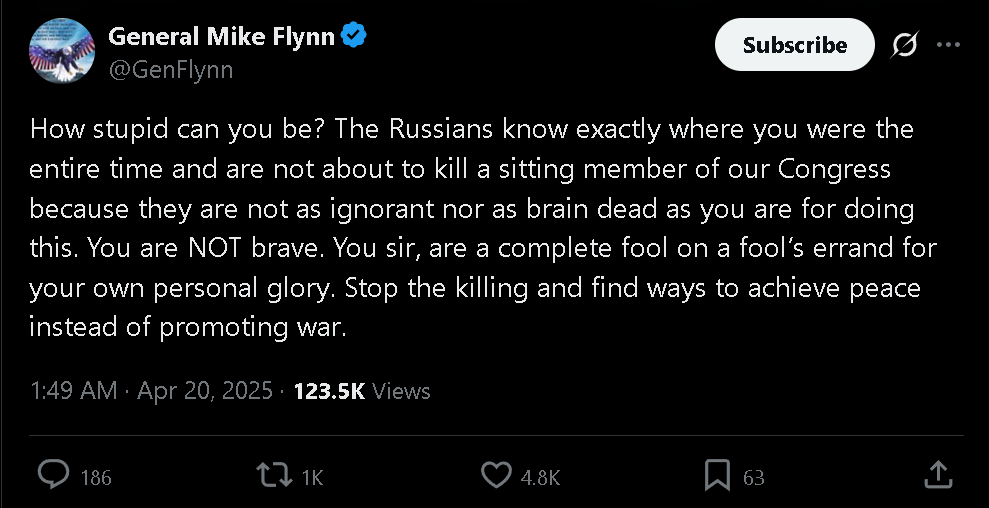 曾擔任美國總統特朗普的國家安全事務助理的美軍退役將軍邁克·弗林,更是發帖大罵菲茨帕特里克是個“純粹的蠢貨”,並稱他應該慶幸俄軍沒有當場把他炸死。